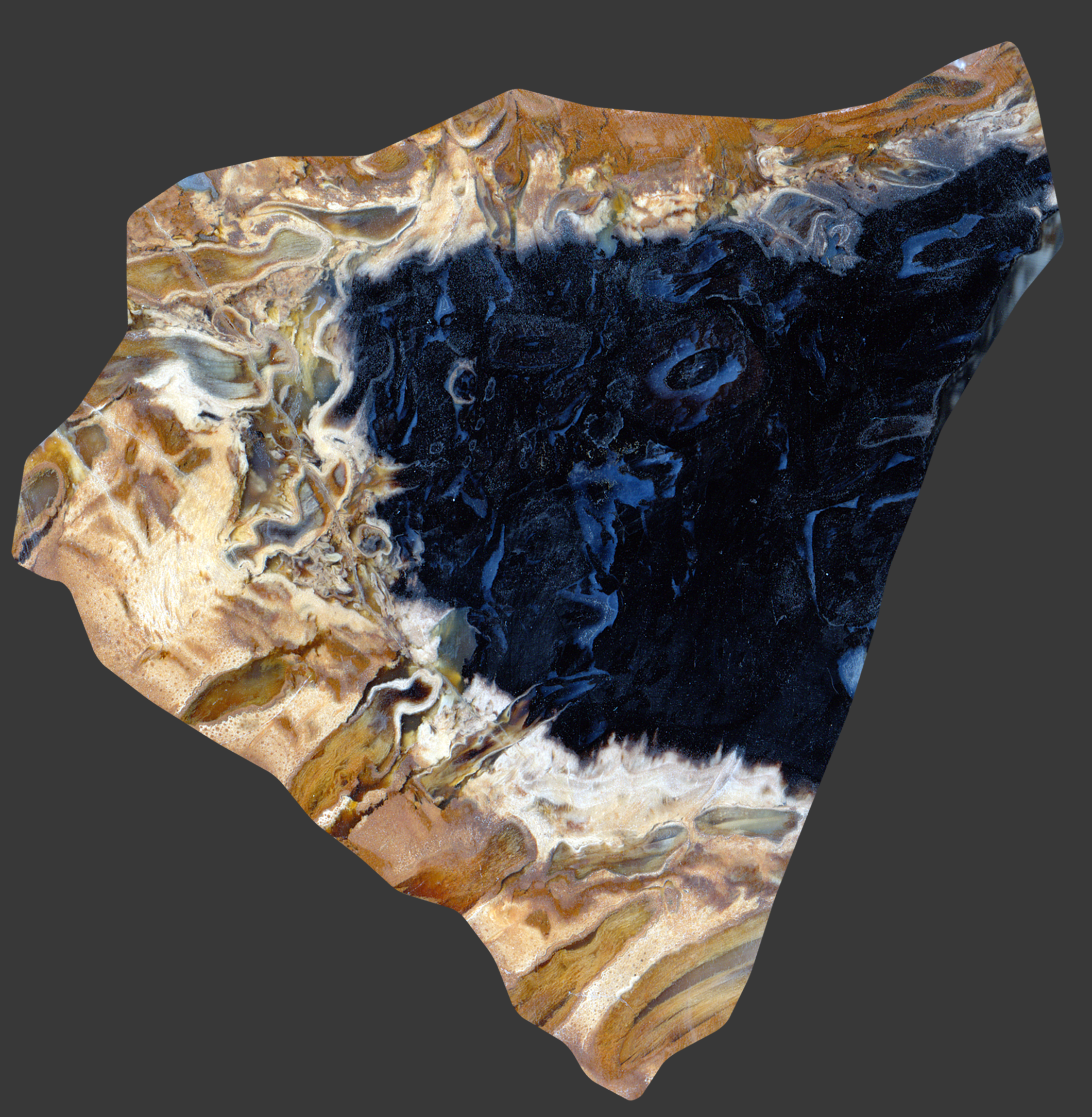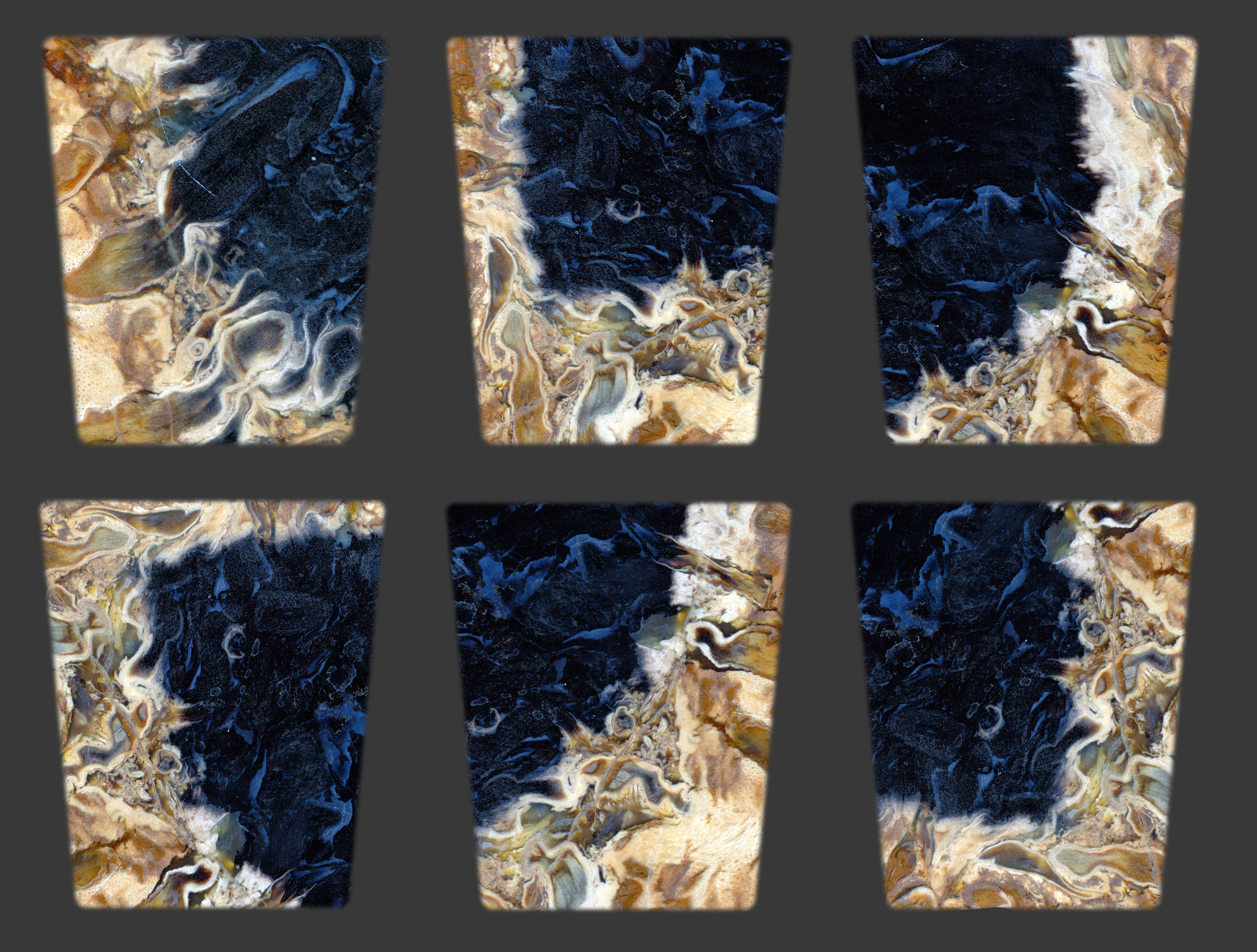 Deciding how to get a bolo out of a slab of birds-eye flame palm root. Front or back offer different pattern, and the surface of the slab offers choices.